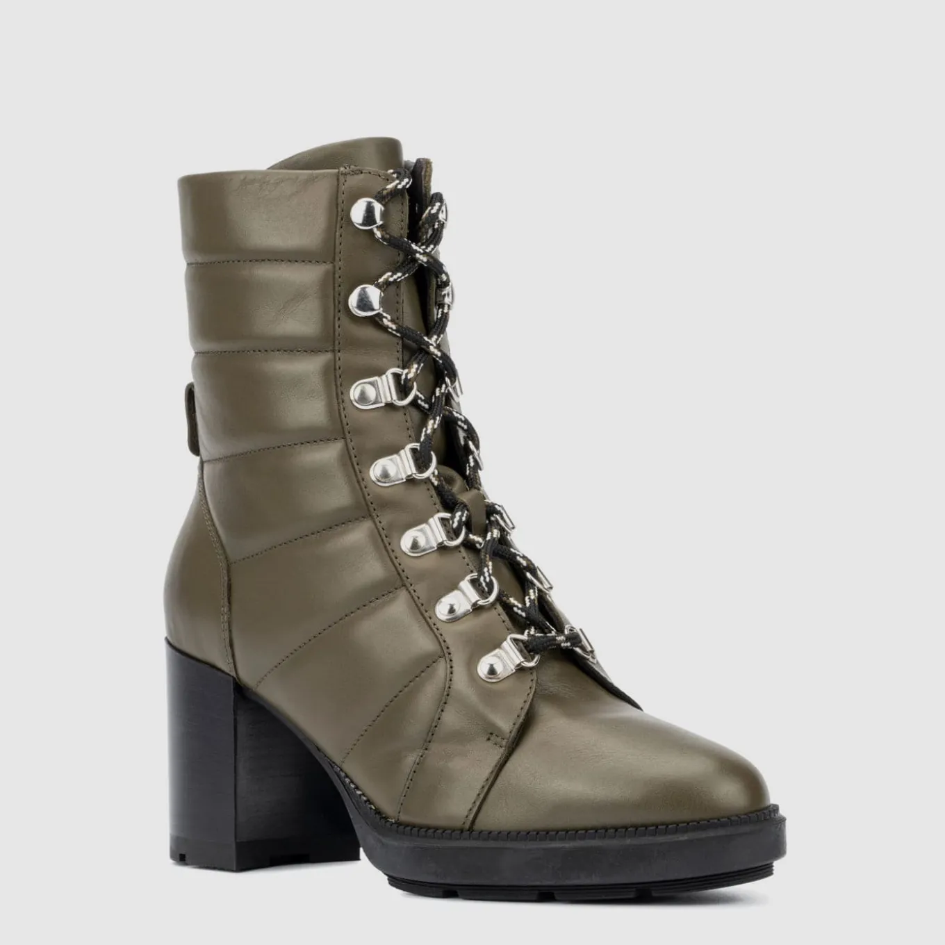 Quilting elevates the ruggedly chic Ivanya Boot, designed in calf leather or soft suede. With a stacked high heel, round-toe shape and lace-up closure, it pairs perfectly with a sleek skirt and opaque hosiery.
